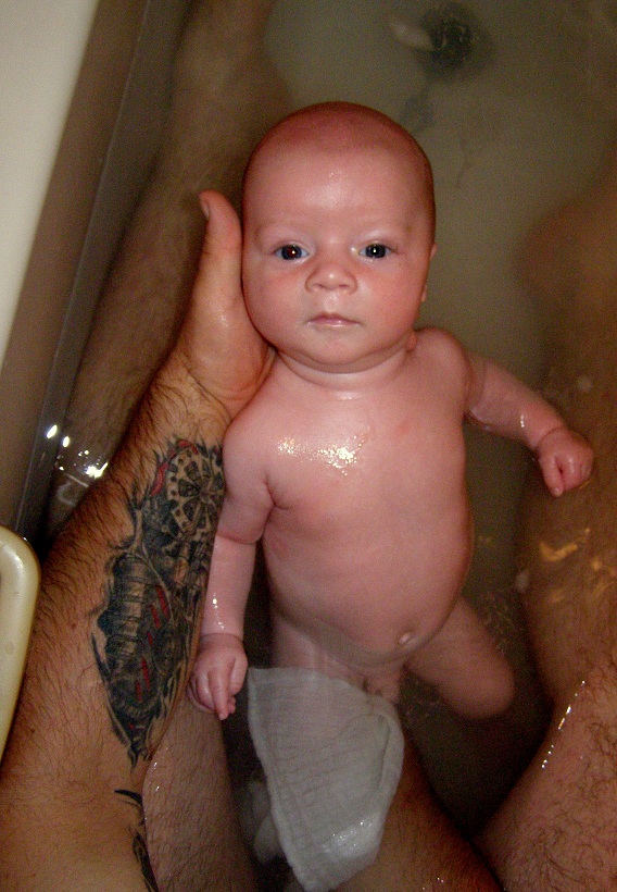 Wprowadziliśmy Olusiowi małą nowość,otóż nie kąpiemy Go już w małej wanience. Teraz codziennie kąpie się razem z Tatusiem w Naszej dużej wannie, a i czasami z Mamą- widać,że to lubi, nie ma płaczu, są uśmiechy, pluskanie i pełna wanna wody w której Oluś może sobie popływać z pomocą któregoś z Nas.